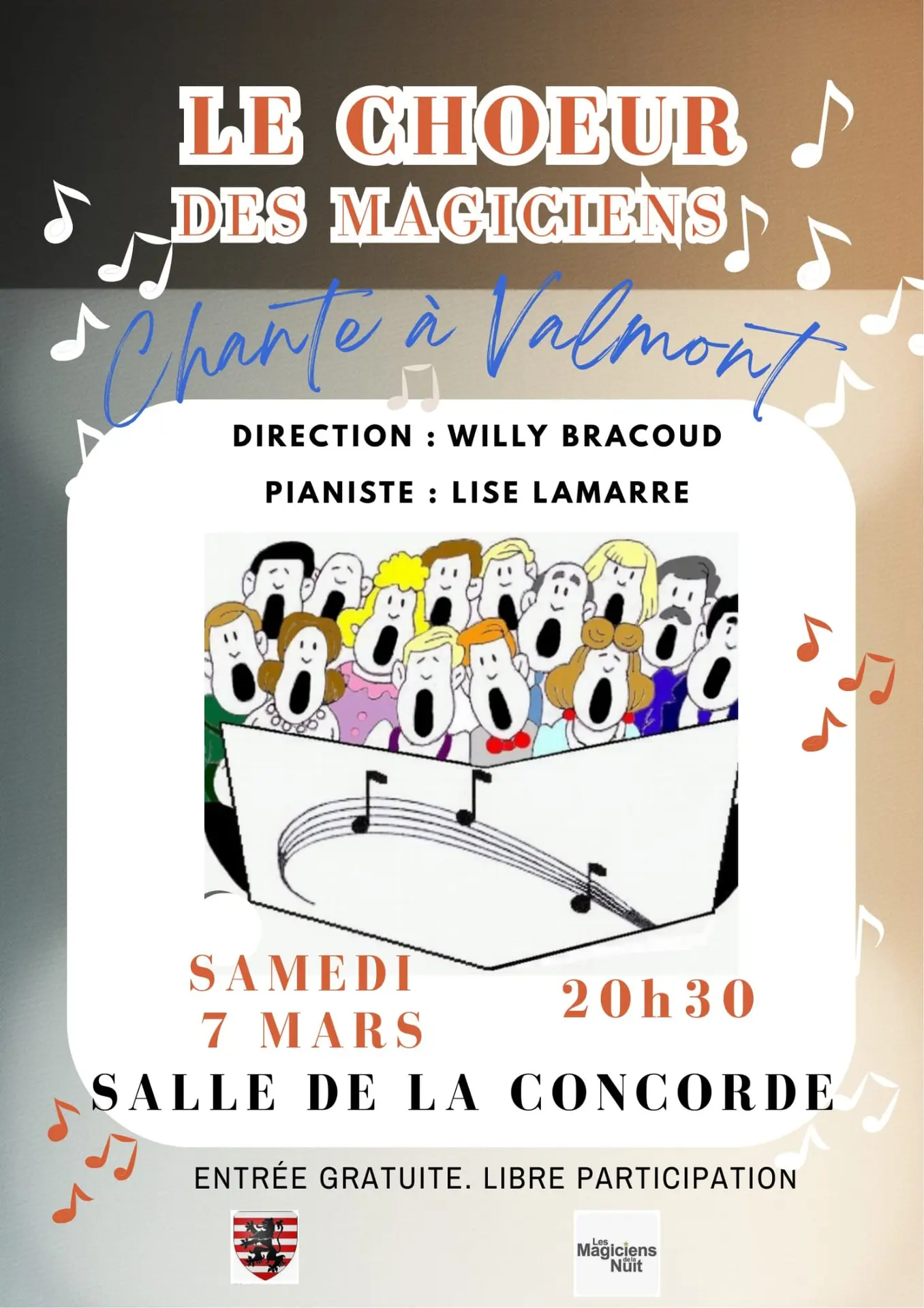 Le Chœur des Magiciens sera en concert à Valmont samedi 7 mars à 20h30 à la salle de la Concorde. Sous la direction de Willy Bracoud, accompagné au piano par Lise Lamarre, le chœur proposera un programme éclectique mêlant chants sacrés, musiques du monde et œuvres chorales contemporaines.