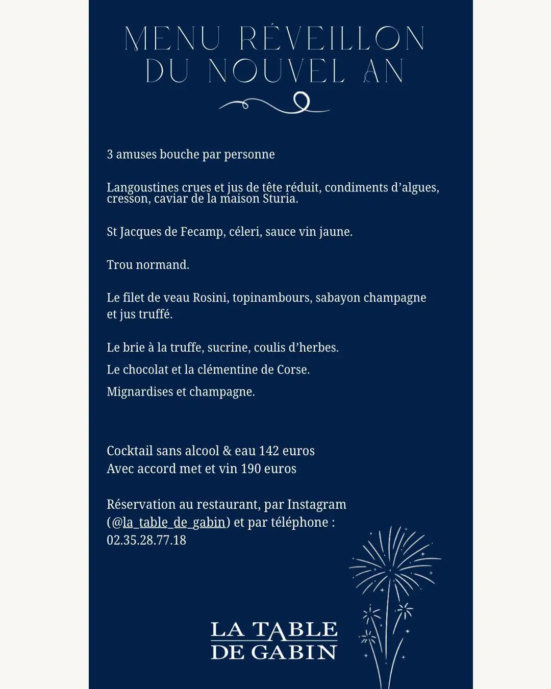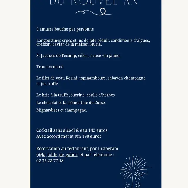 Menu, Cocktail sans alcool & eau à 142€/pers